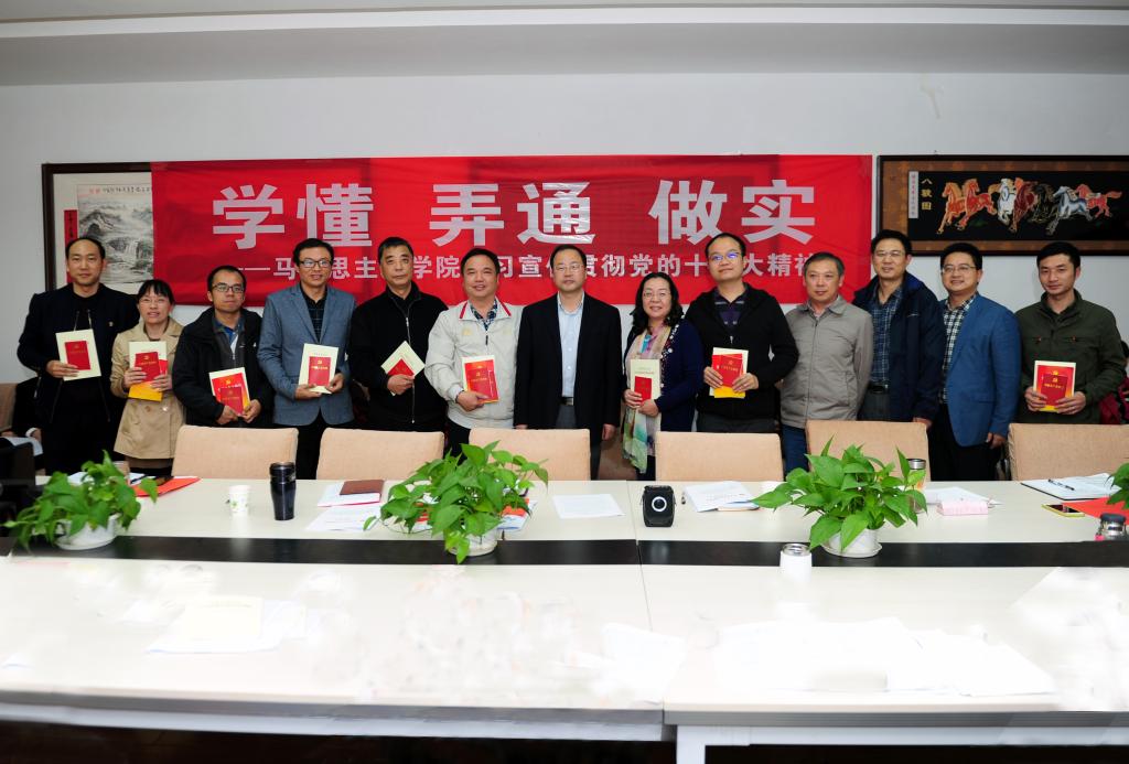 学校党委书记何光彩同志为教工党员、学生代表发放《中国共产党章程》、《党十九大报告辅导读本》和《习近平总书记关于高等教育重要论述摘编》等学习资料。