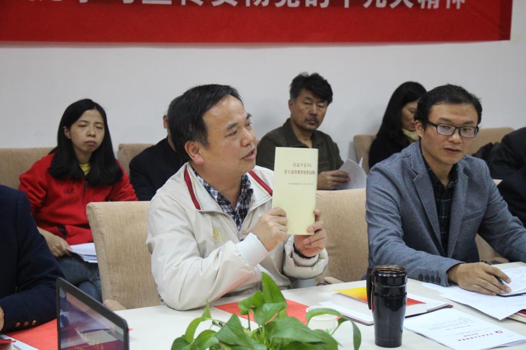 学校党委宣传部部长喻芒清同志就深入学习学校党委印发的《习近平总书记关于高等教育重要论述摘编》活动做动员,并提出学习建议:一是原原本本学、二是结合实际学、三是学以致用。