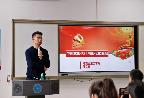 大会第二项,副院长孙文沛同志进行题为《中国式现代化与现代化史观》的主题党课讲授(如图四)。孙文沛教授从五个方面介绍中国式现代化的五大特征,除此之外,孙文沛教授还介绍了现代化史观以及现代化新论,强调要深入学习和牢牢把握现代史观,应该追寻历史,拷问现实,持续努力建设社会主义现代化强国。