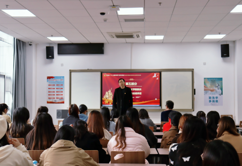 在参观完校史馆之后,下午14:30全体成员共赴东区教学综合楼B0110进行二十大精神学习专题党课与学习心得交流活动,在场师生党员起立奏唱国歌,重温入党誓词后正式开始(如图二),本次会议共五个环节。