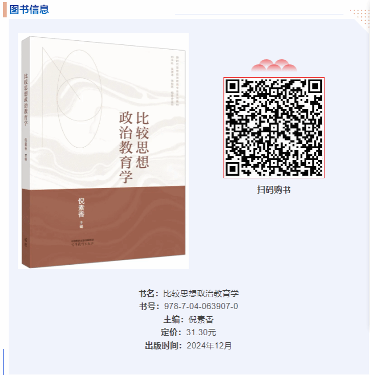 近日,由武汉大学倪素香教授主编,德赢官网傅安洲教授等担任副主编的《比较思想政治教育学》一书由高等教育出版社出版发行。本书是新时代思想政治教育专业系列教材之一,也是高等教育出版社策划的面向思想政治教育专业本科生的系列教材之一。该书坚持以马克思主义为指导,着眼当代国内外思想政治教育发展前沿、内容编排系统全面、作者团队专业权威,具有专题性、综合性、前沿性。