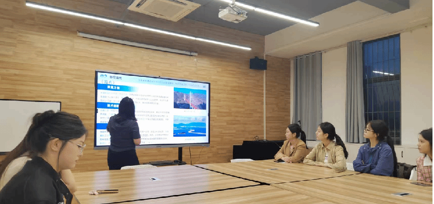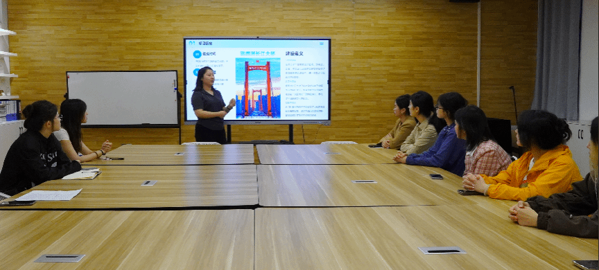 之后,团队成员唐姣正式进行宣讲。唐姣通过“目前武汉长江段共有多少座大桥”这一问题进行导入,并播放视频,表明目前武汉长江段共有十一座大桥。接着,唐姣从最早建设的武汉长江大桥出发,并分别对武汉长江二桥、鹦鹉洲长江大桥及杨泗港长江大桥进行介绍,展现了武汉桥梁建设的艰辛历程,体现了中国桥梁事业的巨大跨越。