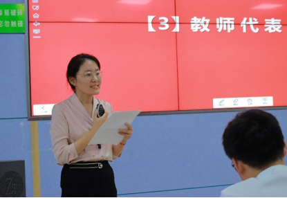 思政系青年教师罗丽娅作为教师代表发言。她从三个关键词“读书”、“思考”、“实践”出发,向新生同学们分享了自己过往的求学经历和工作经历,表达了躬耕教坛强国有我的信念,鼓励新同学们牢记求真务实、艰苦奋斗的校训精神,耐得住寂寞,坐得住冷板凳,开展系统阅读,打下坚实的科研基础,在新的征程中敢于迈出第一步,敢于试错,不怕失败并学会自我赋能。