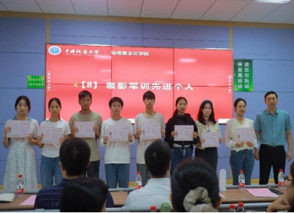 表彰军训先进个人。武彦斌宣读学院关于表彰军训先进个人的文件,并由院长阮一帆为鲍睿豪、李宇航、刘翔、刘蓓蓓、刘灿灿、王颖妍、陈丽竹、陈书涵等八名同学颁发荣誉证书。