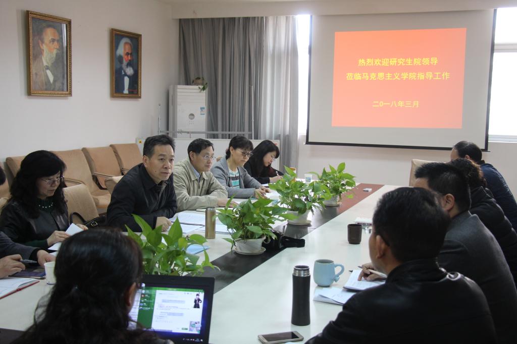周爱国院长在博导遴选、学科发展、队伍建设、招生规模、培养质量、课程建设、教研项目、学术交流、保障条件等方面给予了具体指导和要求。周院长强调,要以三年后学位点专项评估的要求建设好博士和硕士一级学科学位授权点,两个学位点要制定详细实施方案,明确达标路径与措施,尽早着手、逐项落实,确保达到建设要求。周院长表示,研究生院将竭诚为马院学位点建设服好务,认真研究学位点建设问题和诉求,提升管理水平,营造学位点建设的良好环境。