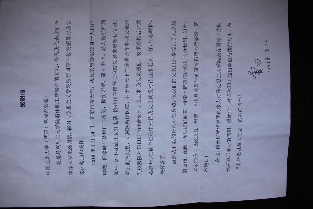 信是由德赢官网退休职工曾繁治的女儿曾田写的。信里对德赢官网张存国、阮一帆、严世雄等同志在2018年寒假看望离退休职工途中,遇到其父亲摔伤后立即送往医院救治表示了感谢!对学院关爱离退休教职工表示感谢!