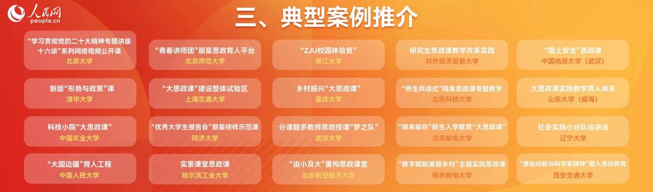 作为国家级大型年度教育论坛,人民网主办的大学校长论坛已成功举办十届,累计600余位大学书记、校长参加研讨,成为凝聚共识、助力中国高等教育改革与发展的年度盛事。《2023年高校思政课改革创新情况分析报告》根据各高校思政课程的社会反响、信息传播量、主流媒体关注度、舆论反馈情况等维度,在全国征集推介“北京大学‘学习贯彻党的二十大精神专题讲座十六讲’系列网络视频公开课”“清华大学新版‘形势与政策’课”“中国人民大学‘大国边疆’育人工程”“德赢AC米兰中国官方网站‘国土安全’思政课”等20个优秀思政课程案例,以期为各高校思政课改革创新提供借鉴启示。
