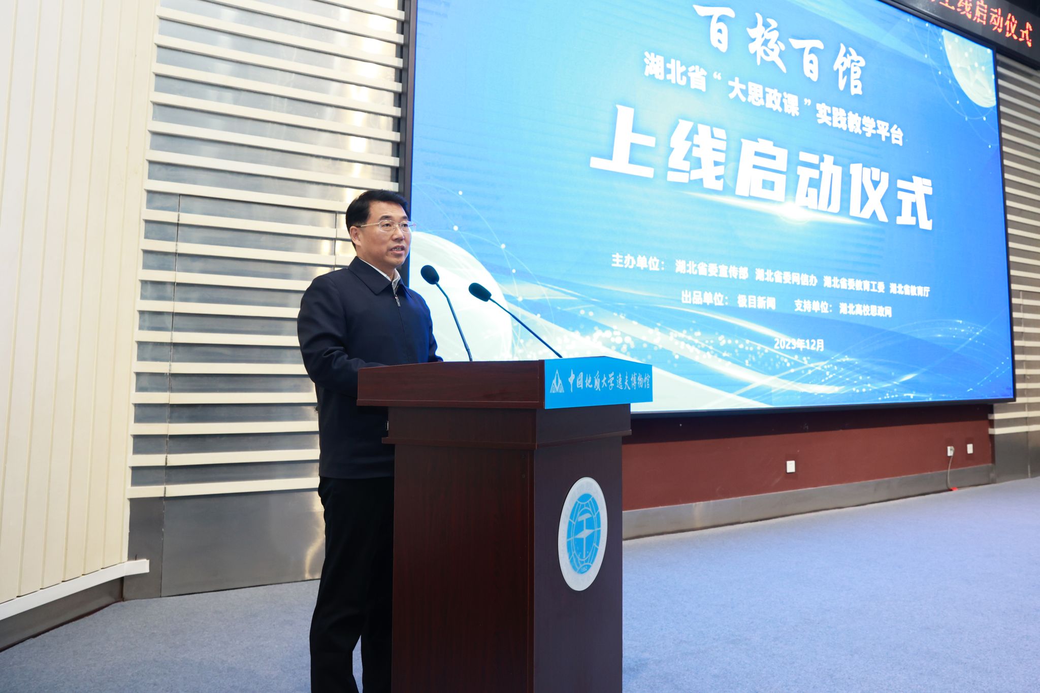 地大新闻网讯 (记者 孙彦钦)12月20日,“百校百馆”——湖北省“大思政课”实践教学平台上线启动仪式在德赢官网逸夫博物馆举行。仪式现场发布了“百校百馆”平台首批上线展馆名单,即日起,湖北大中小学师生及学生家长,可通过线上平台一键预约,实地打卡首批已入驻平台的科技馆、博物馆、艺术馆等场馆。